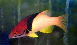 The Coral Hogfish, also known as Eclipse Hogfish or Mesothorax Hogfish. Juveniles are burgundy with yellow spots and as they develop into adults they loose the spots and have a burgundy face with rosy-yellow posterior, separated by a black stripe.
